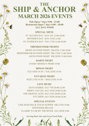 🌼 March 2026 at The Ship & Anchor 🌼 Spring is on the way and we’ve got a packed month ahead… Special Celebration Menus Themed Food Nights Darts Every…