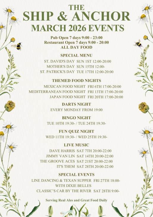 🌼 March 2026 at The Ship & Anchor 🌼 🌼 March 2026 at The Ship & Anchor 🌼 Spring is on the way and we’ve got a packed month ahead… Special Celebration Menus Themed Food Nights Darts Every… Read more 1/1