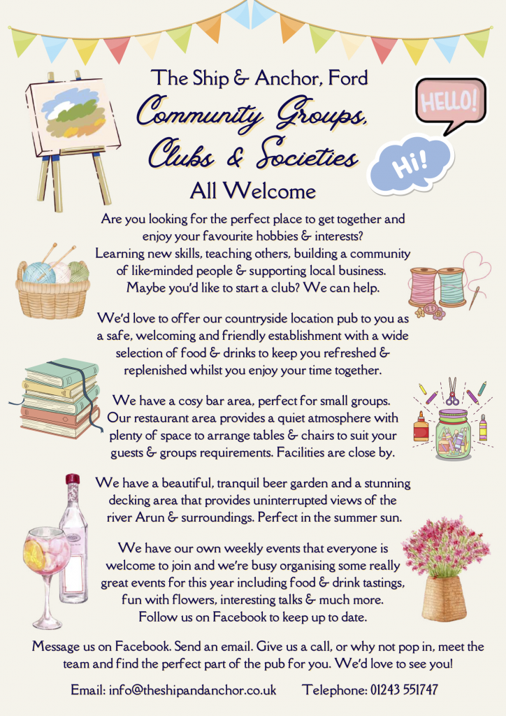 Weโre excited to open our doors to local groups, clubs and anyone looking to bring people together here at The Ship & Anchor.