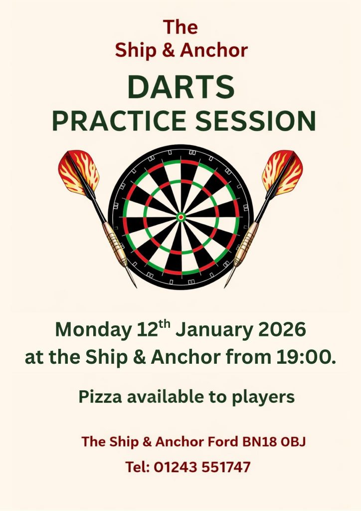 Come and join our first darts practice session on Monday 12th January 2026 at the Ship & Anchor, Ford starting from 19.00.